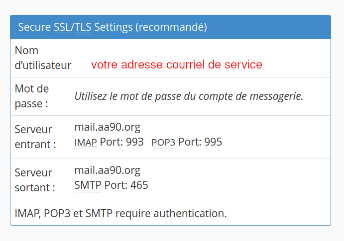 Vous avez reçu un courriel à votre adresse personnelle contenant les identifiants pour renseigner les champs de connexion. Comme les mots de passe sont complexes vous pouvez les copier/coller du message reçu par courriel vers ces champs. Pour utiliser le courriel de service de la Région, nous mettons à votre disposition l’application suivant sur nos serveurs: https://webmail.aa90.org/