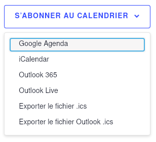 L’option Exporter le fichier .ics téléchargera un fichier .ics que vous pourrez ajouter à toute autre application de votre choix. Une fois exporté, ce fichier ne changera pas, vous devrez donc exporter un nouveau fichier .ics chaque fois que de nouveaux événements sont ajoutés ou modifiés.